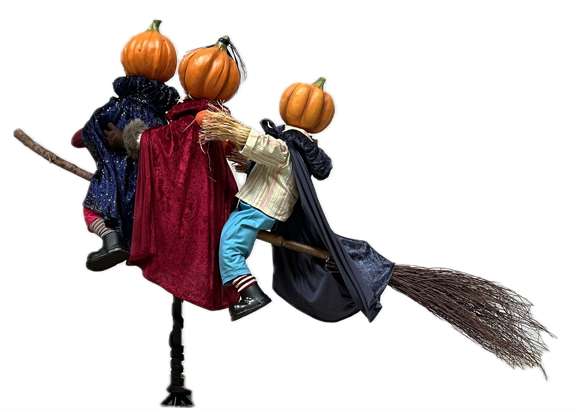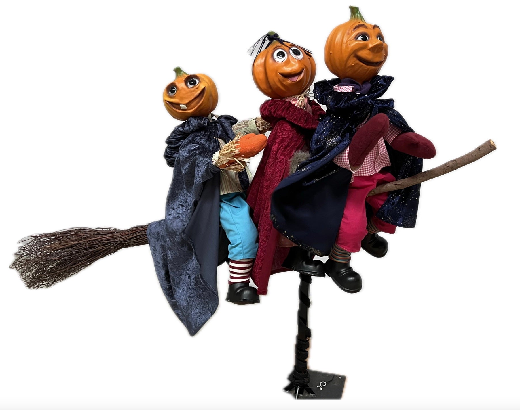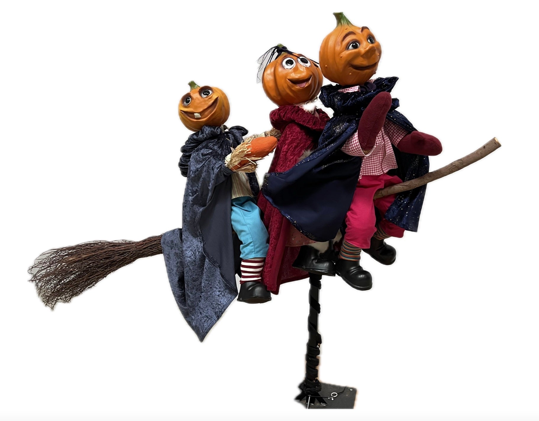 Diese Gruppe aus 3 Kürbisfiguren fliegt scheinbar auf einem Reisigbesen.