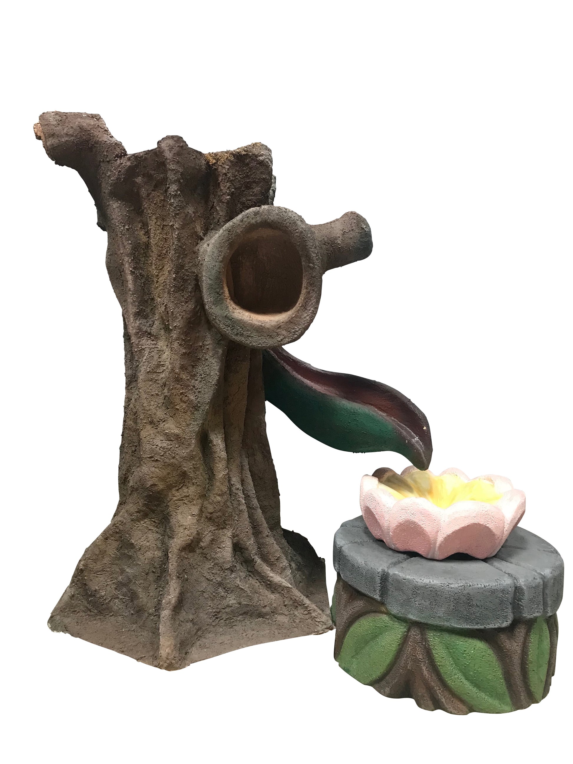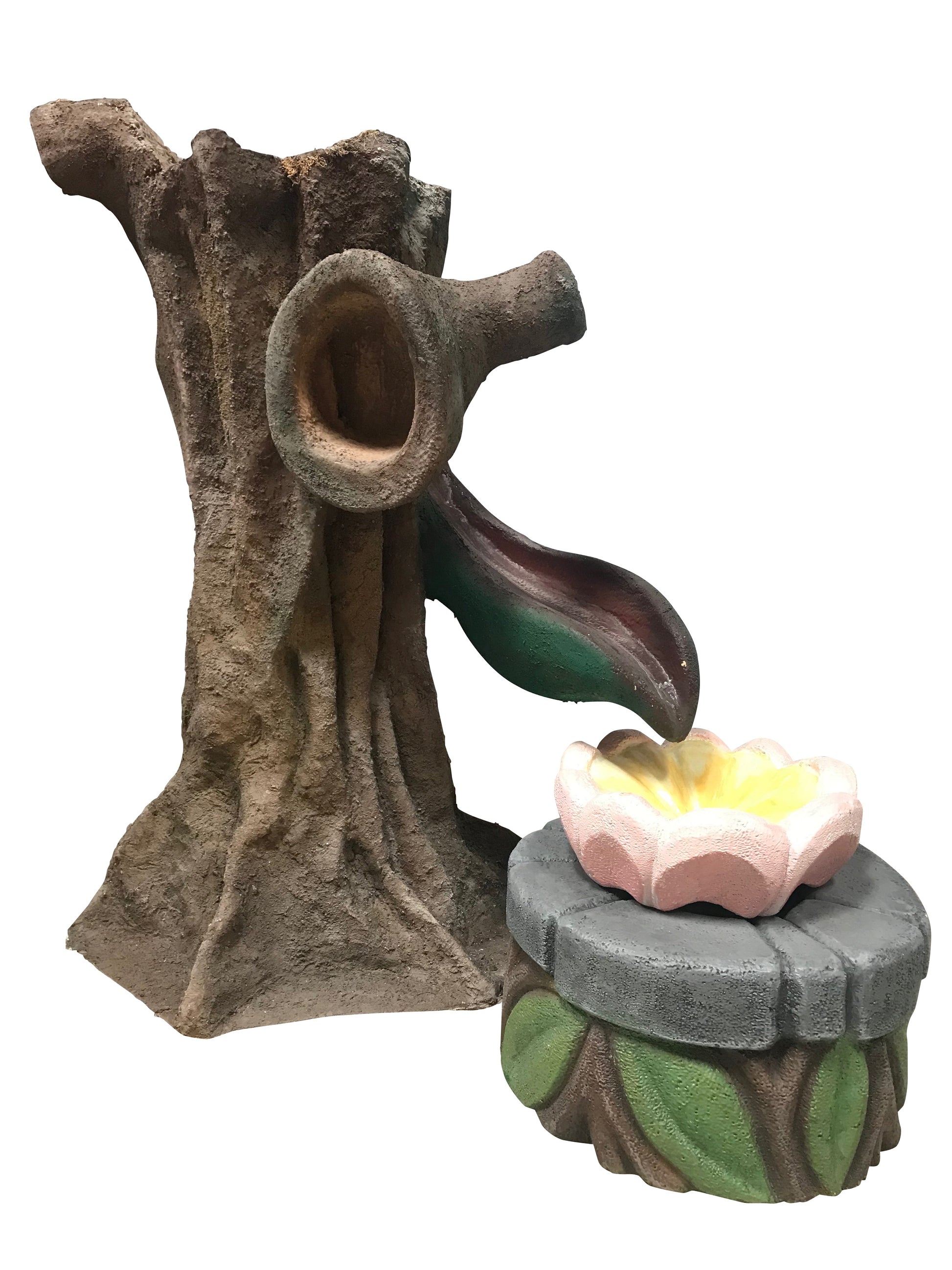 Dieser aus GFK gefertigte Baumstamm hat ein großes Astloch in dem eine Figur dekoriert werden kann. Über die blattartige Rinne kann Wasser abtropfen, welches in einen kleinen See oder in unsere extra zu erwerbende Brunnenblüte abgeführt werden kann.