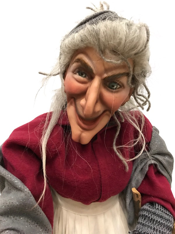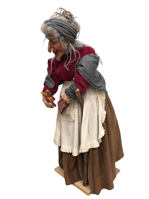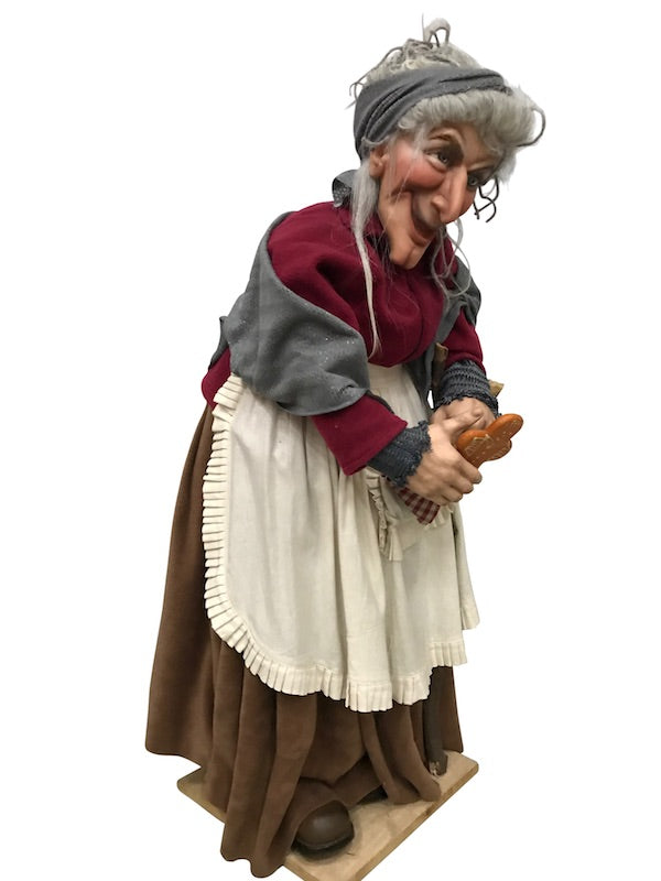 Hexenfigur mit typisch gebeugter Haltung. Die Figur hält einen Lebkuchen in den Händen.
