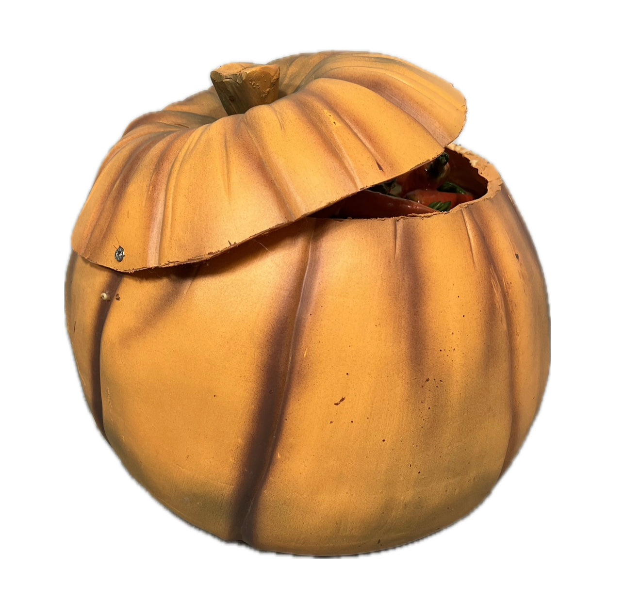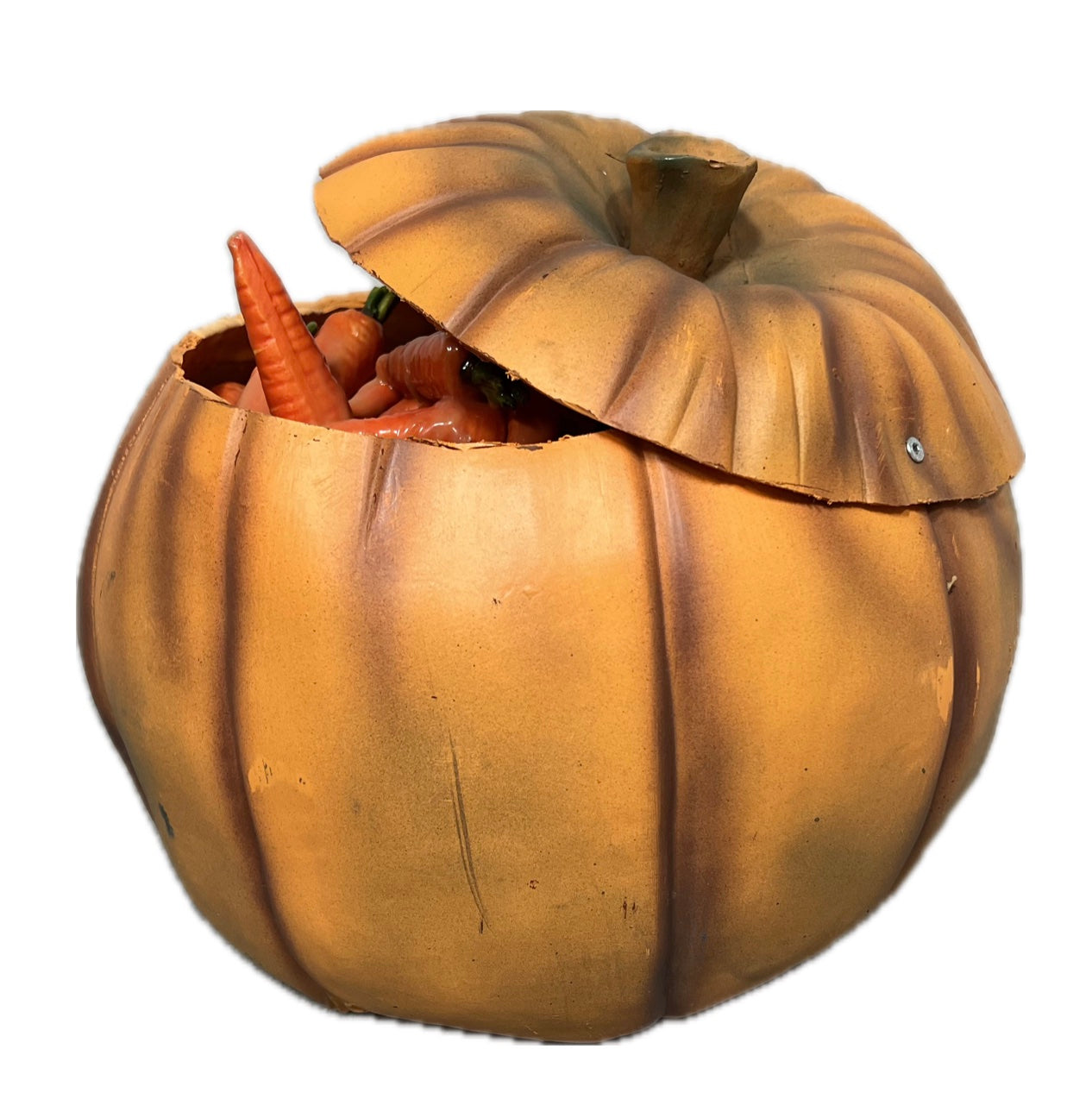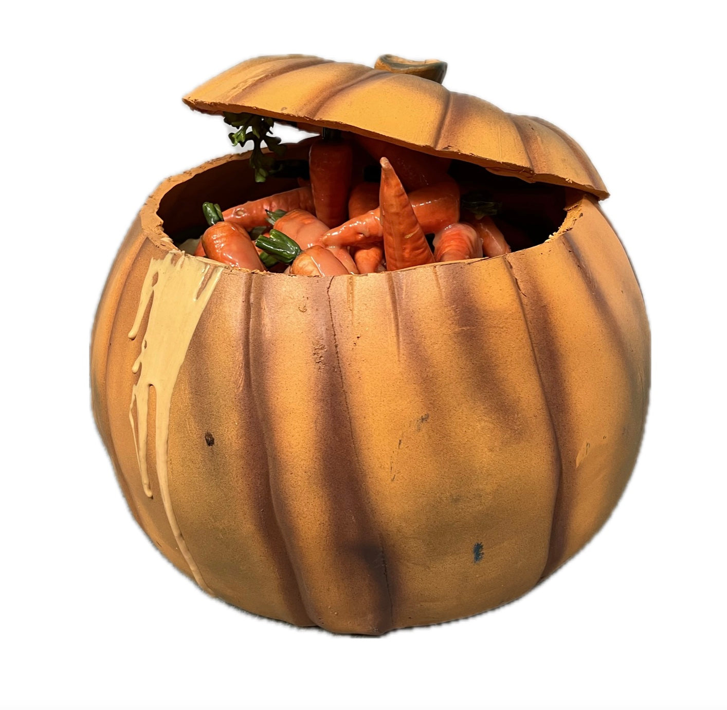 Kürbisnachbildung aus Polyurethan mit Durchmesser 35 cm. Möhrenattrappen und eine künstlich nachgebildete Suppe lassen das Objekt fast real erscheinen.