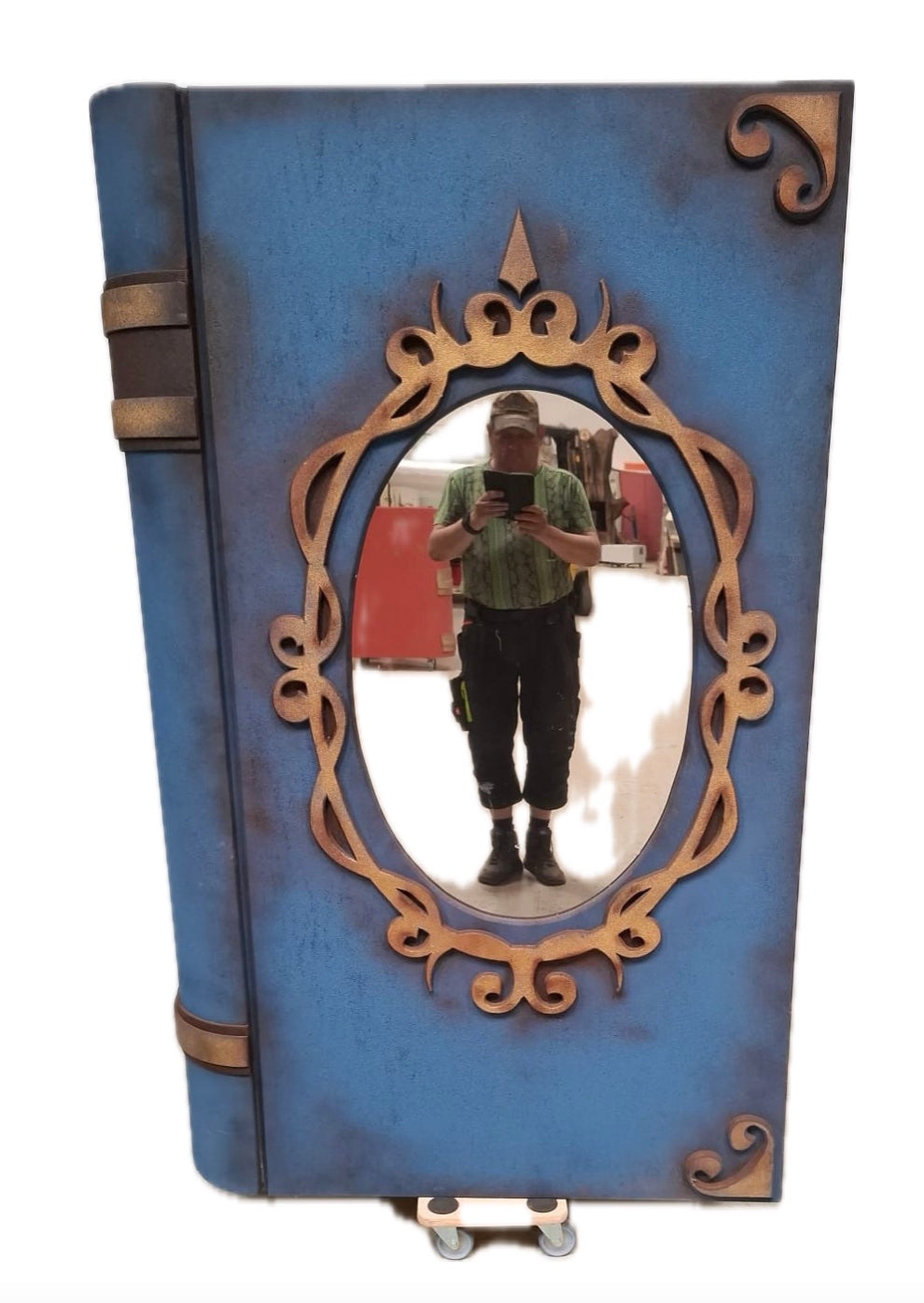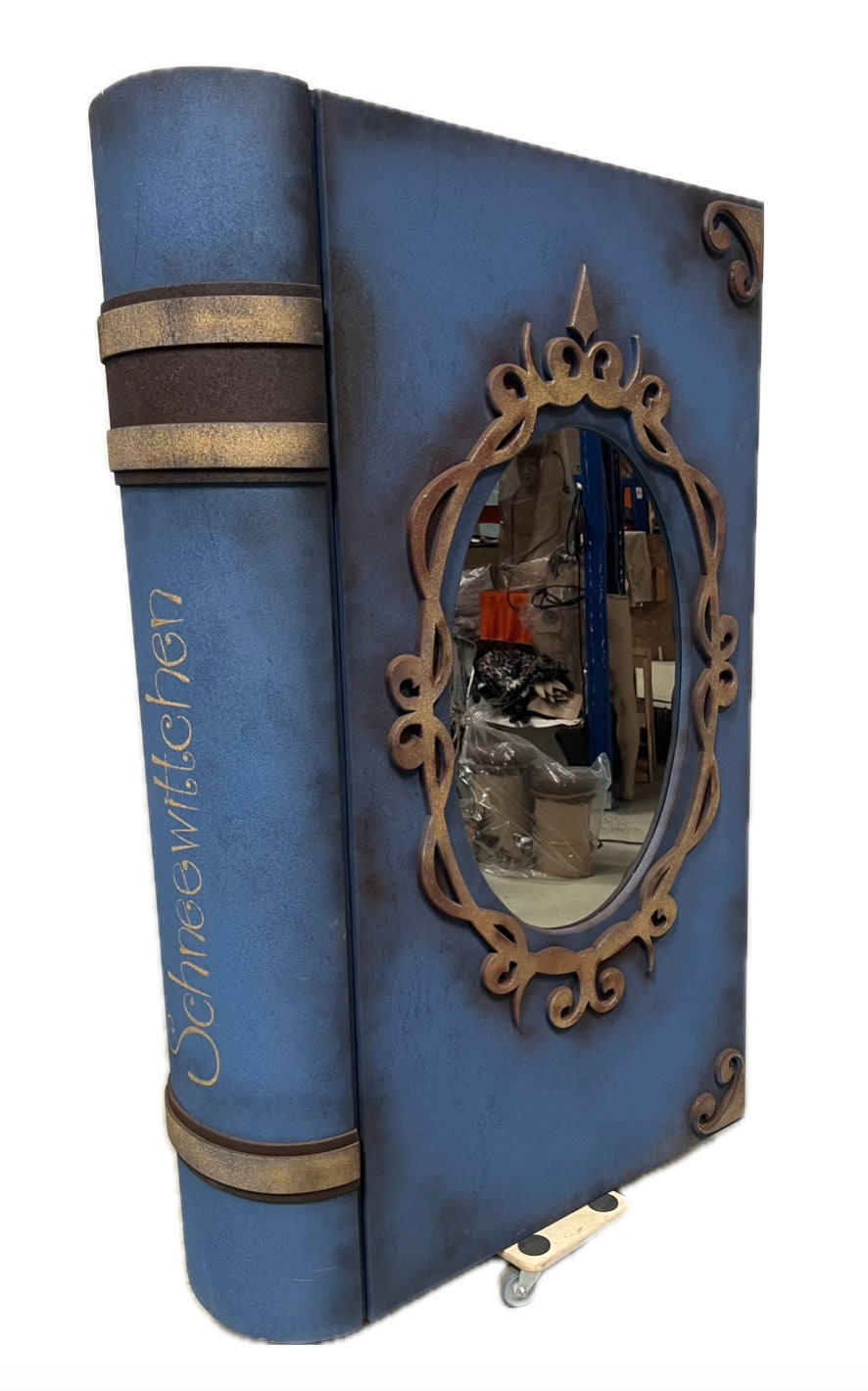 Dieses schön gestaltete und massiv gebbaute Märchenbuch verkaufen wir aus unserem Vermietungsbestand. Das Buch hat im Inneren eine Hohlraum für eine Schneewittchenfigur. Der halbdurchlässige Spiegel gibt die Sicht aufg das Innere des Buches immer dann frei wenn die relaisgesteuerte Beleuchtung im Inneren des Buches eingeschaltet wird.